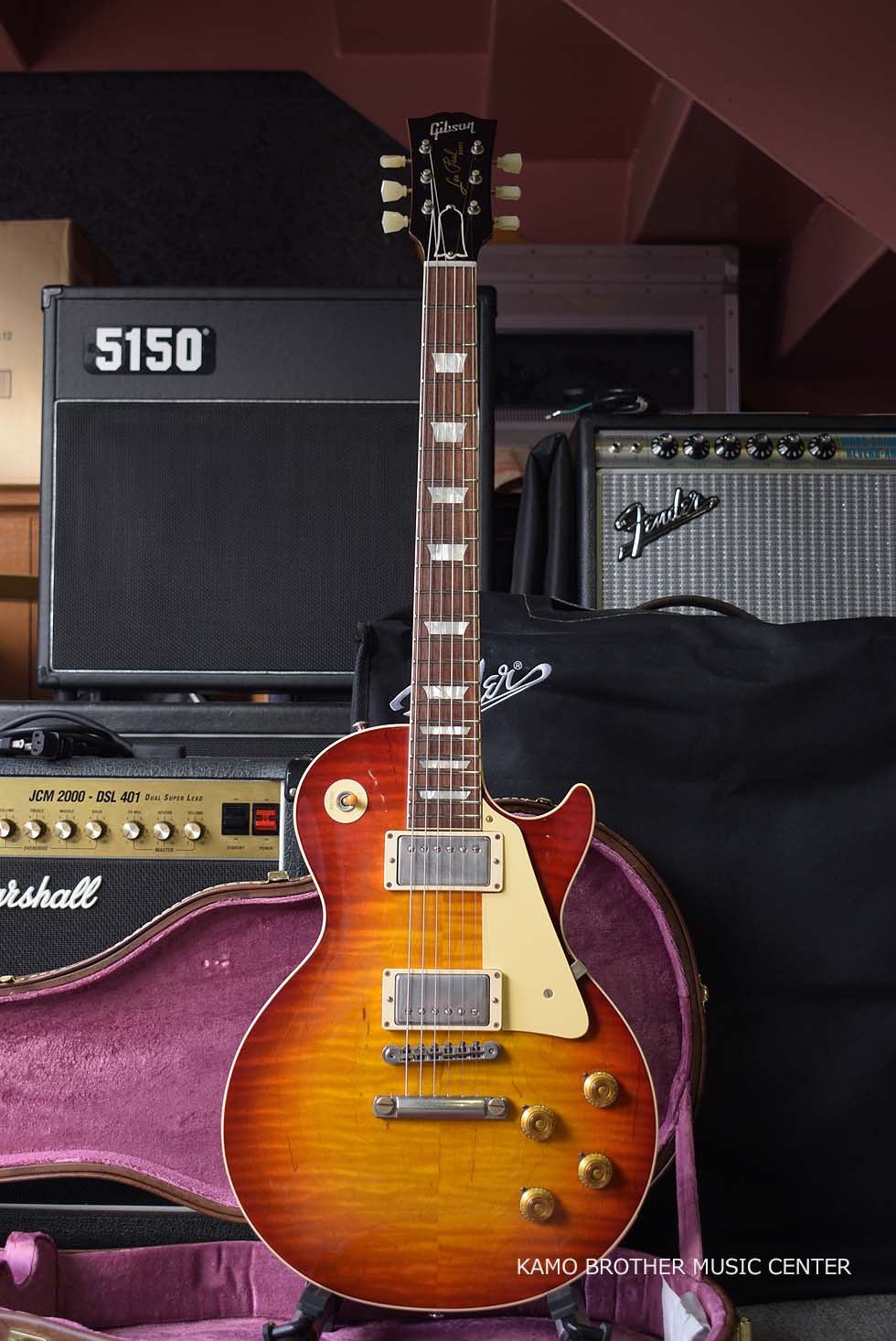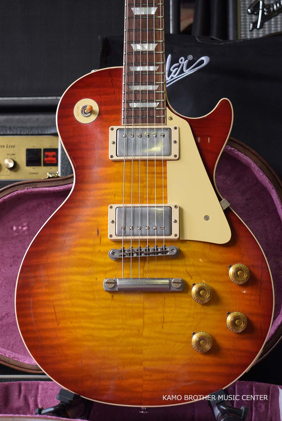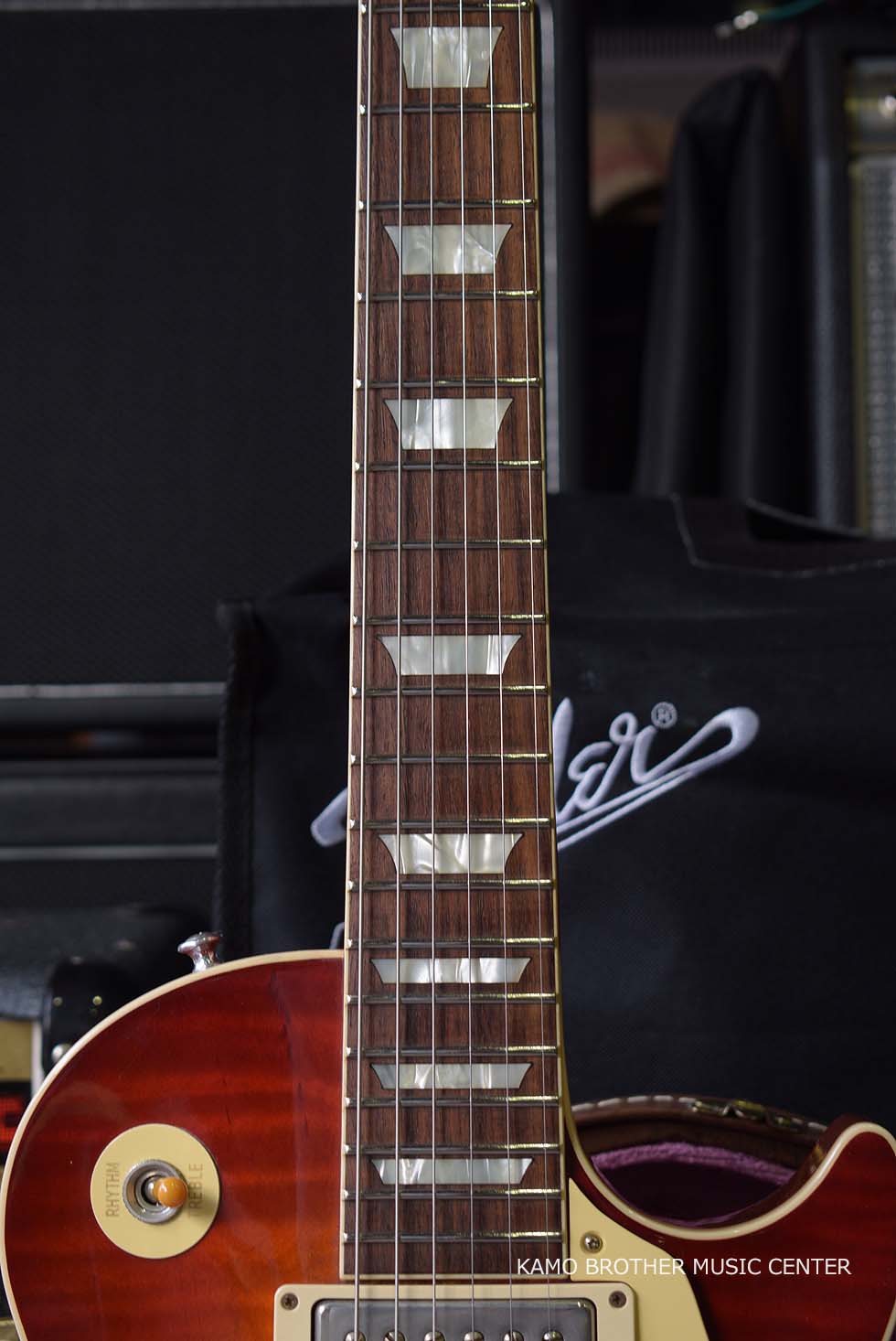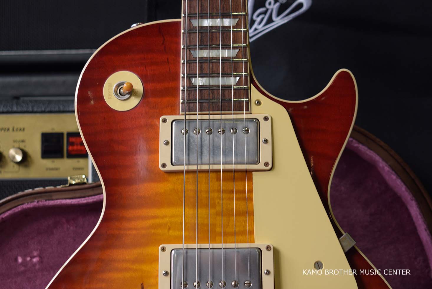 2018年製、ハンドセレクトトップの59LP VOSのUSEDです。 カラーはVintage Cherry Sunburst。 ワイルドでありながら堂々たる風格を備えたハンドセレクトならではのトップに、コントロールノブ周辺には雰囲気良く自然に入ったウェザーチェックが見られます。 細かな擦り傷や小さな打痕こそあるものの、全体的には丁寧に扱われてきた印象のきれいな状態で、フレットの消耗は10%未満にとどまり、ネックコンディションも良好です。 重量3.83㎏