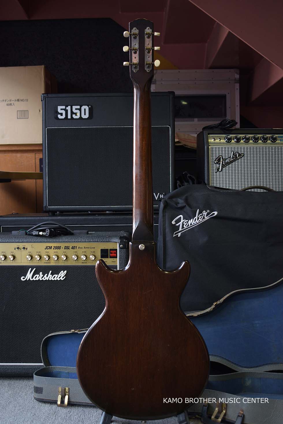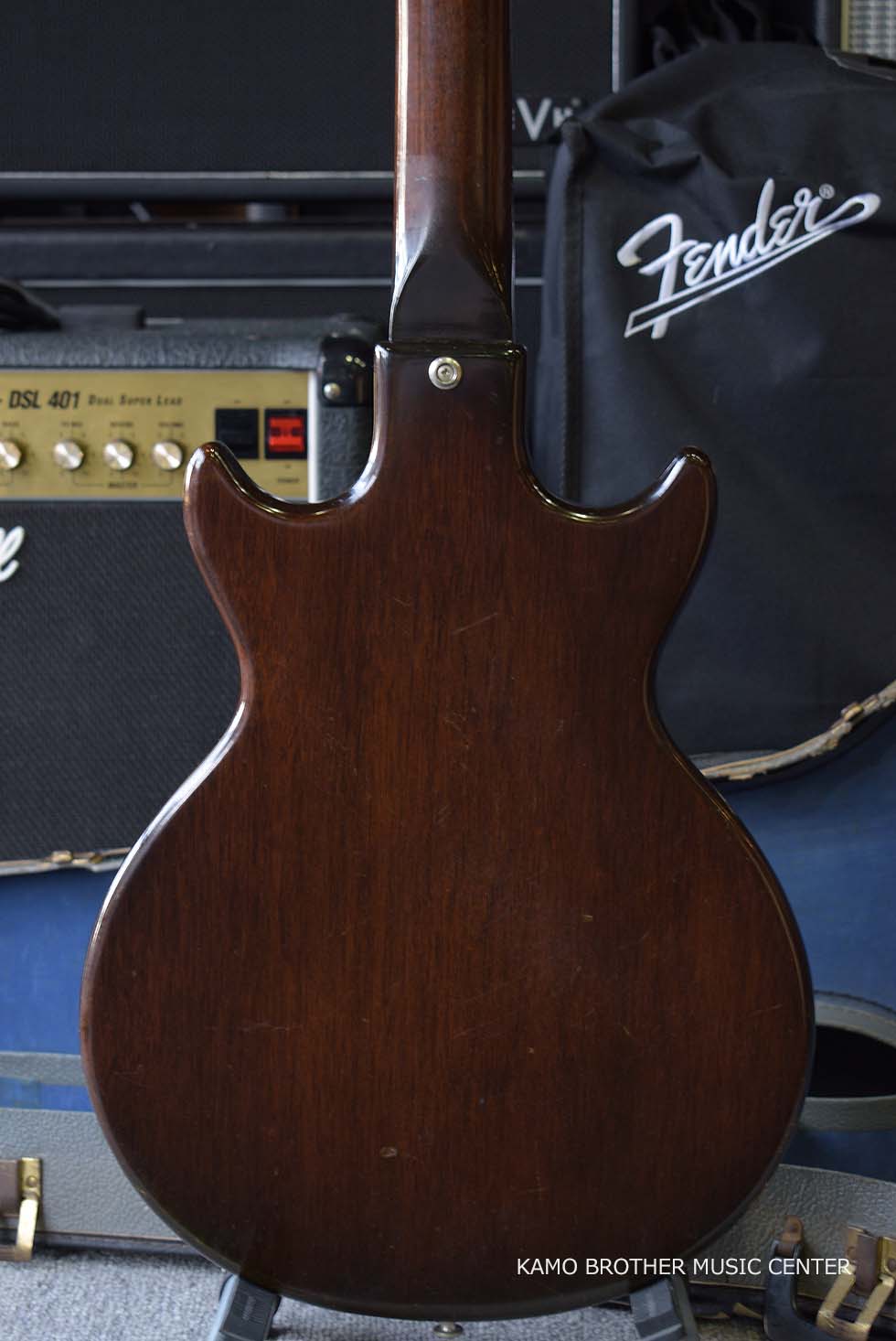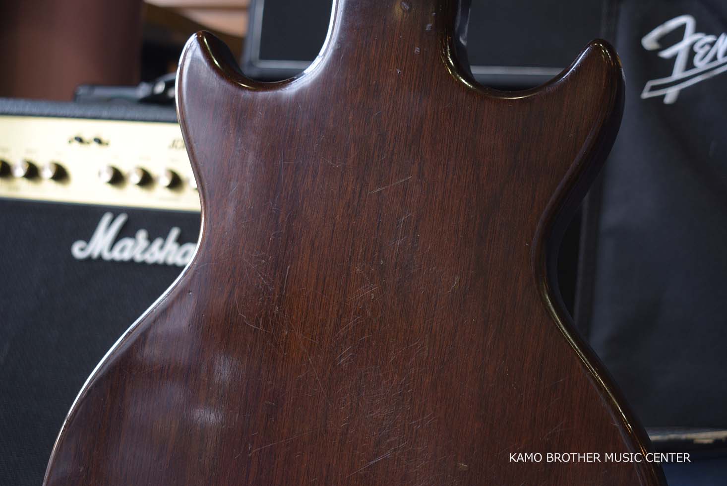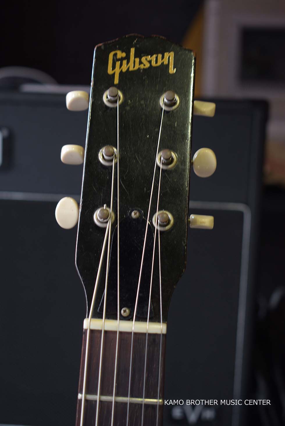 ダメージとしては、ボディホーン部サイドに塗装の削れがあり、ピックガードの「Melody Maker」ロゴは消えています。また、4弦ペグの軸が曲がっており、ストラップピンは交換されています。