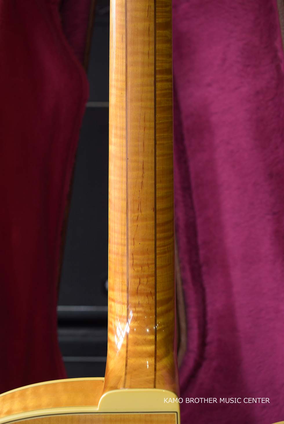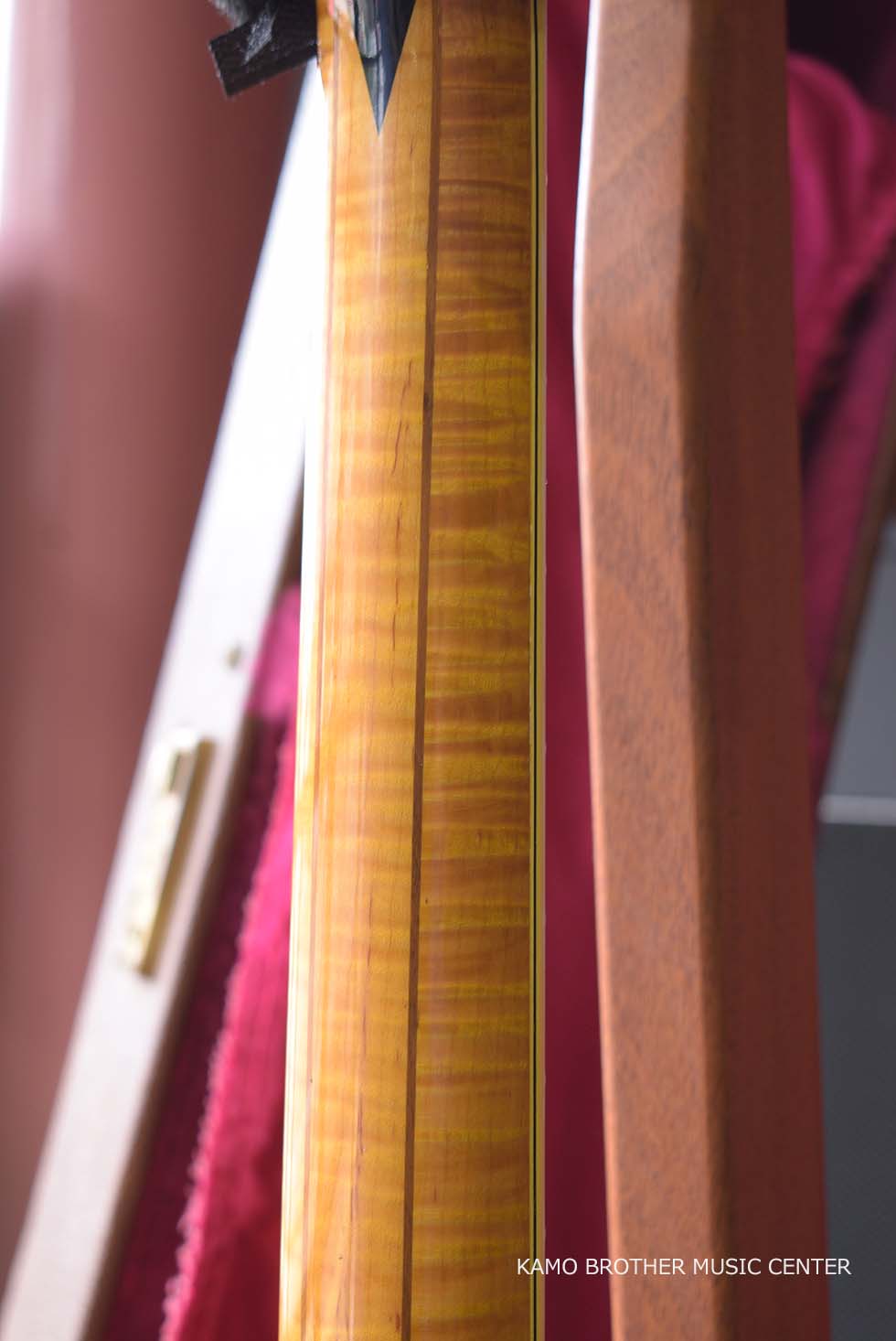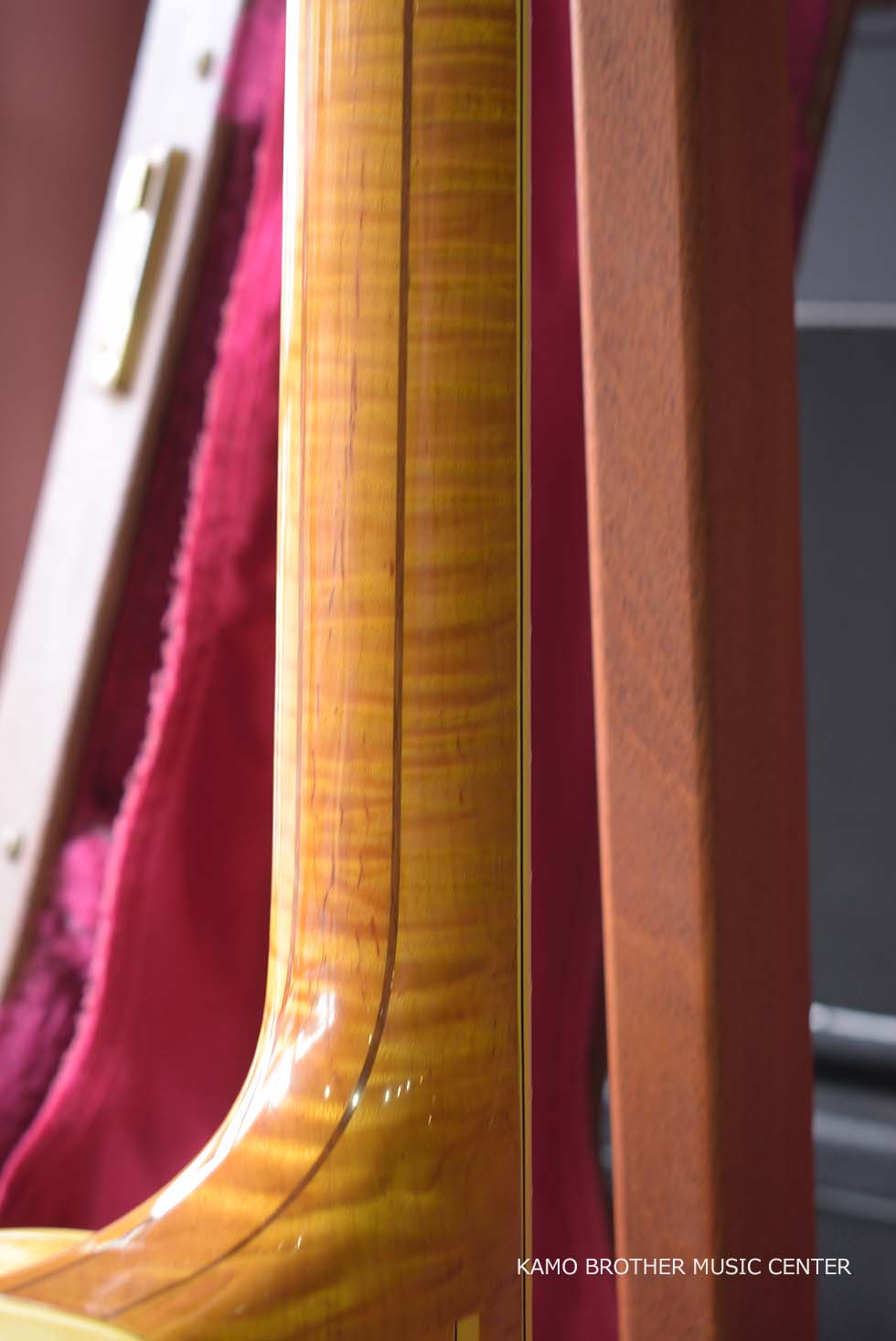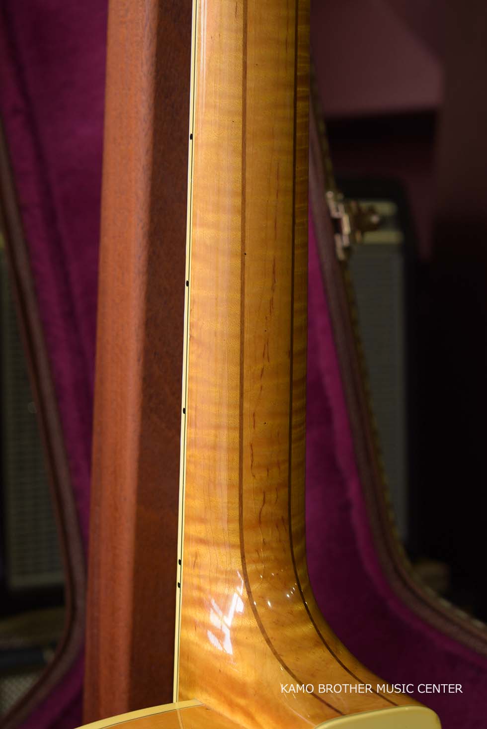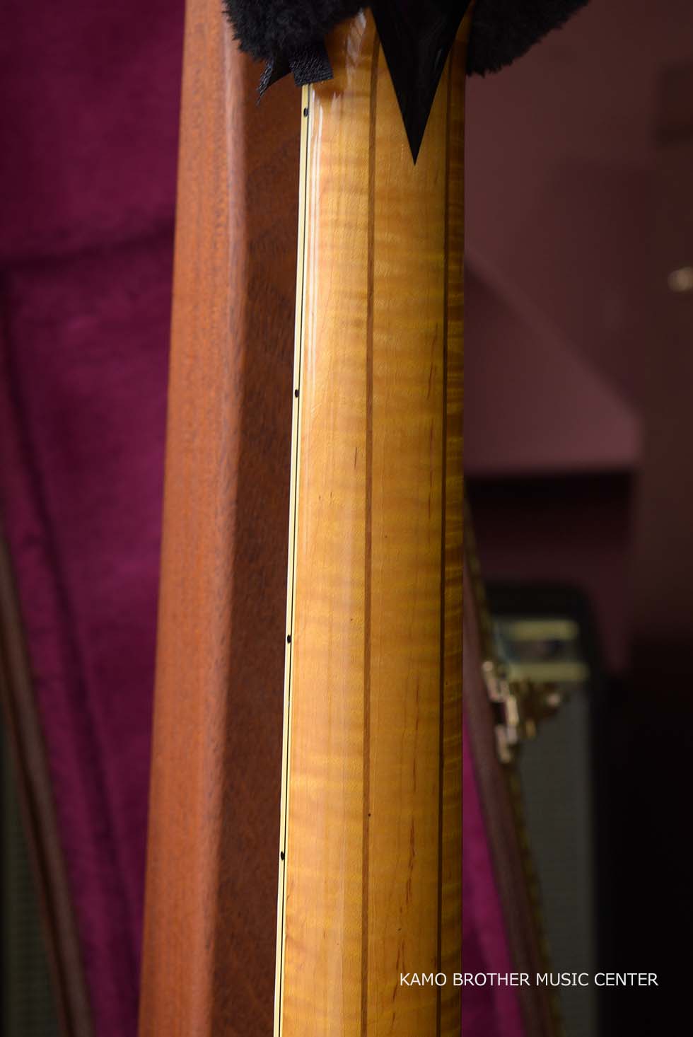 使用木材は非常に高品質で、指板のエボニー材は黒々としており、ボディはもちろんのことネックに至るまで素晴らしいフレイムメイプルで製作されています。
