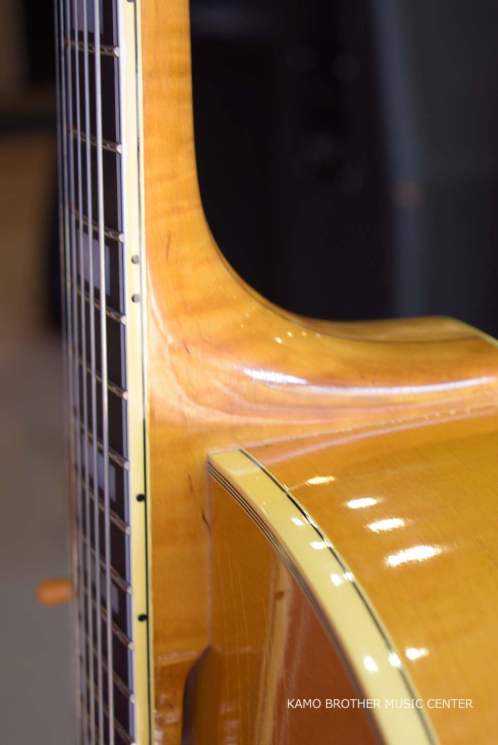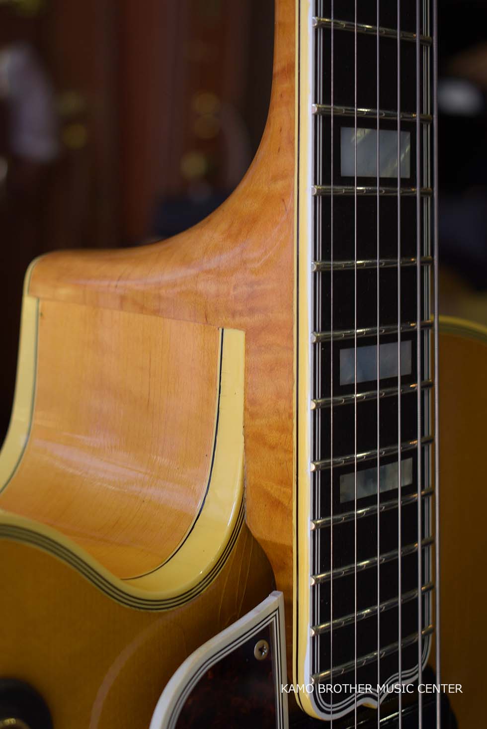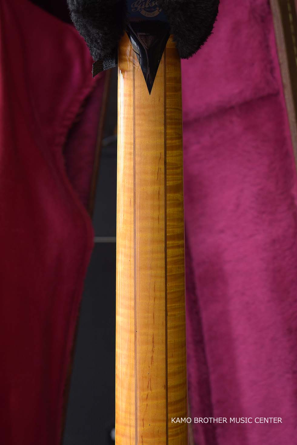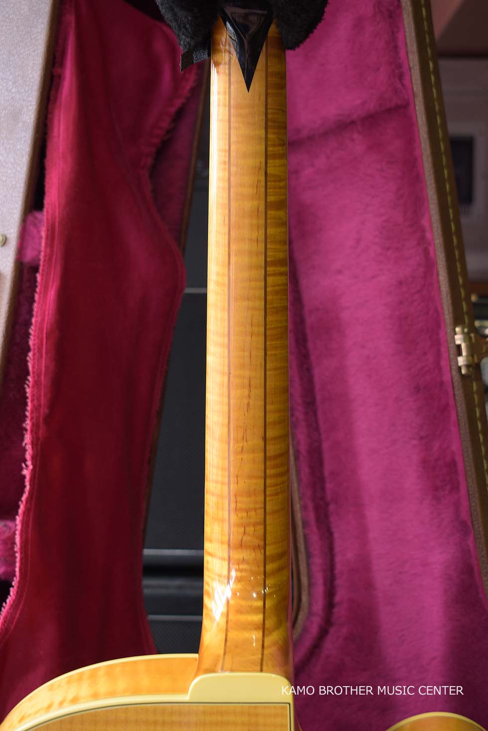使用木材は非常に高品質で、指板のエボニー材は黒々としており、ボディはもちろんのことネックに至るまで素晴らしいフレイムメイプルで製作されています。