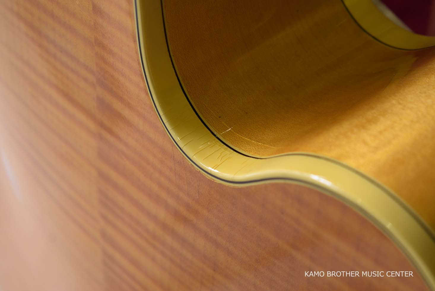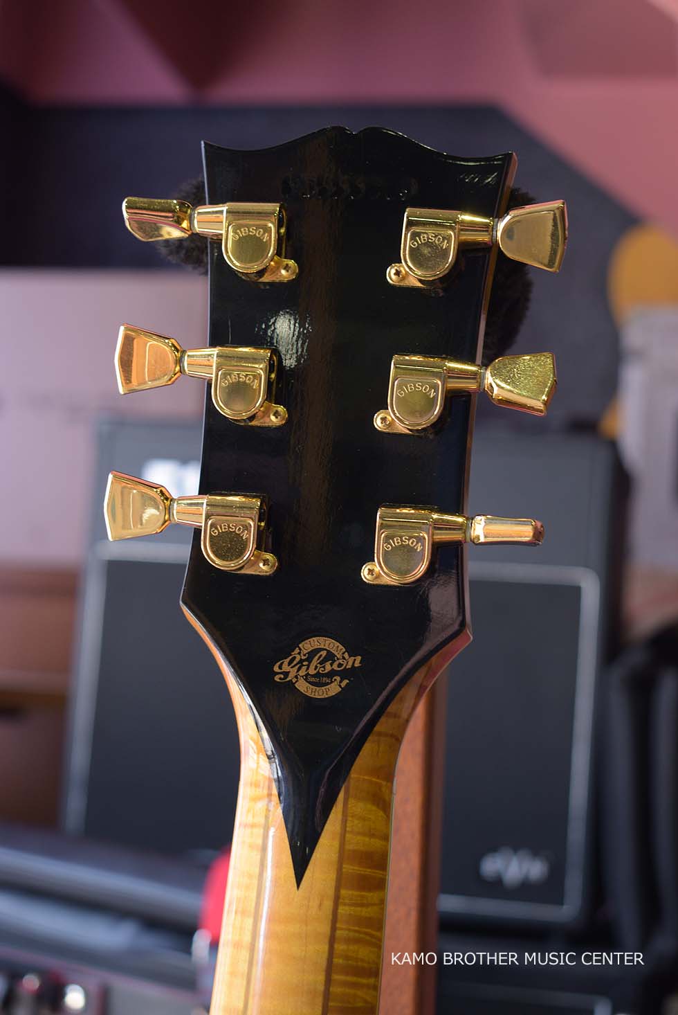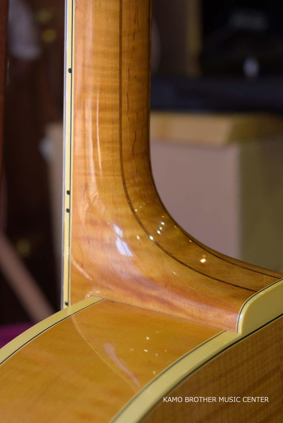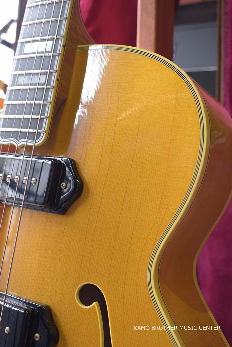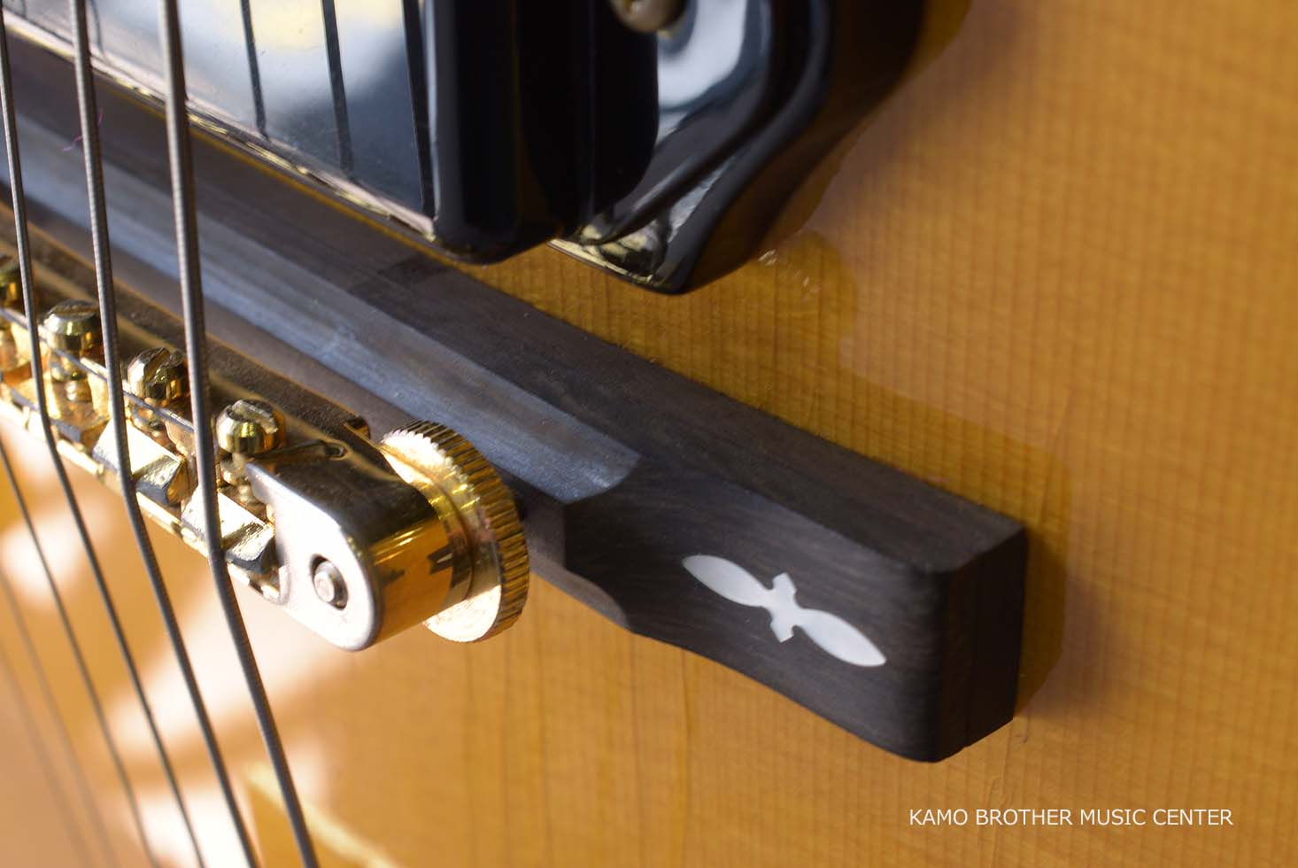 使用木材は非常に高品質で、指板のエボニー材は黒々としており、ボディはもちろんのことネックに至るまで素晴らしいフレイムメイプルで製作されています。