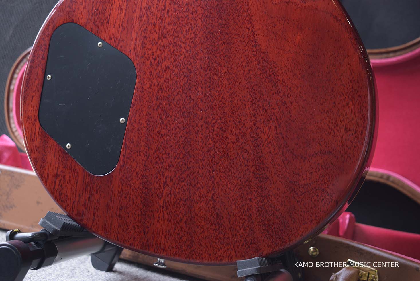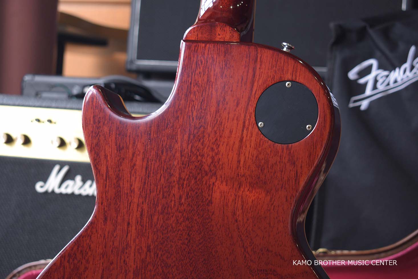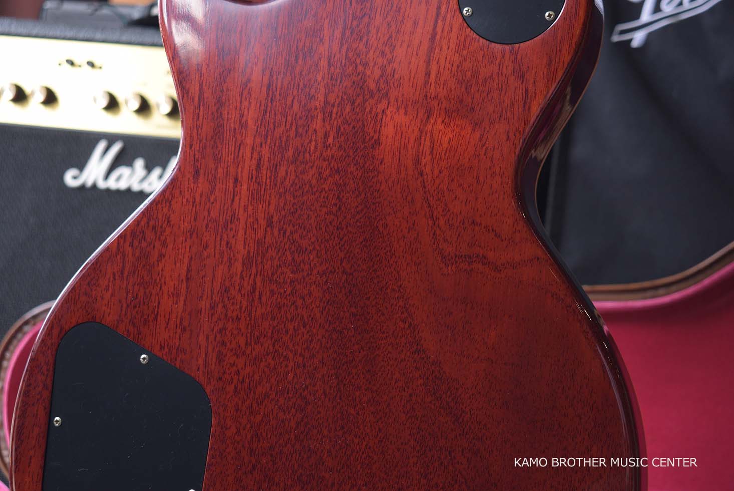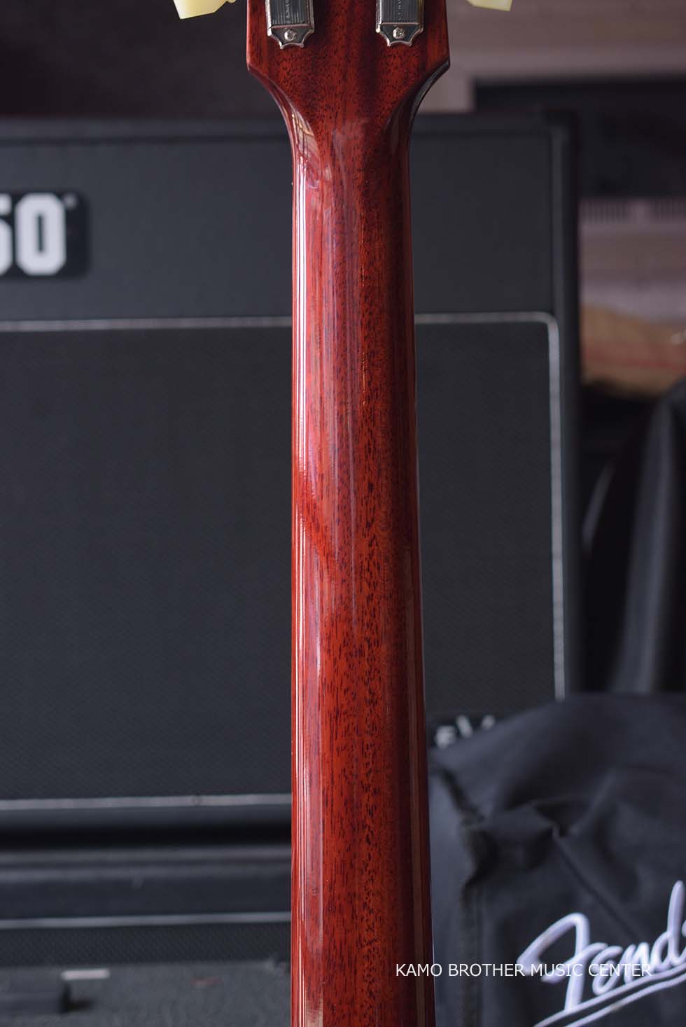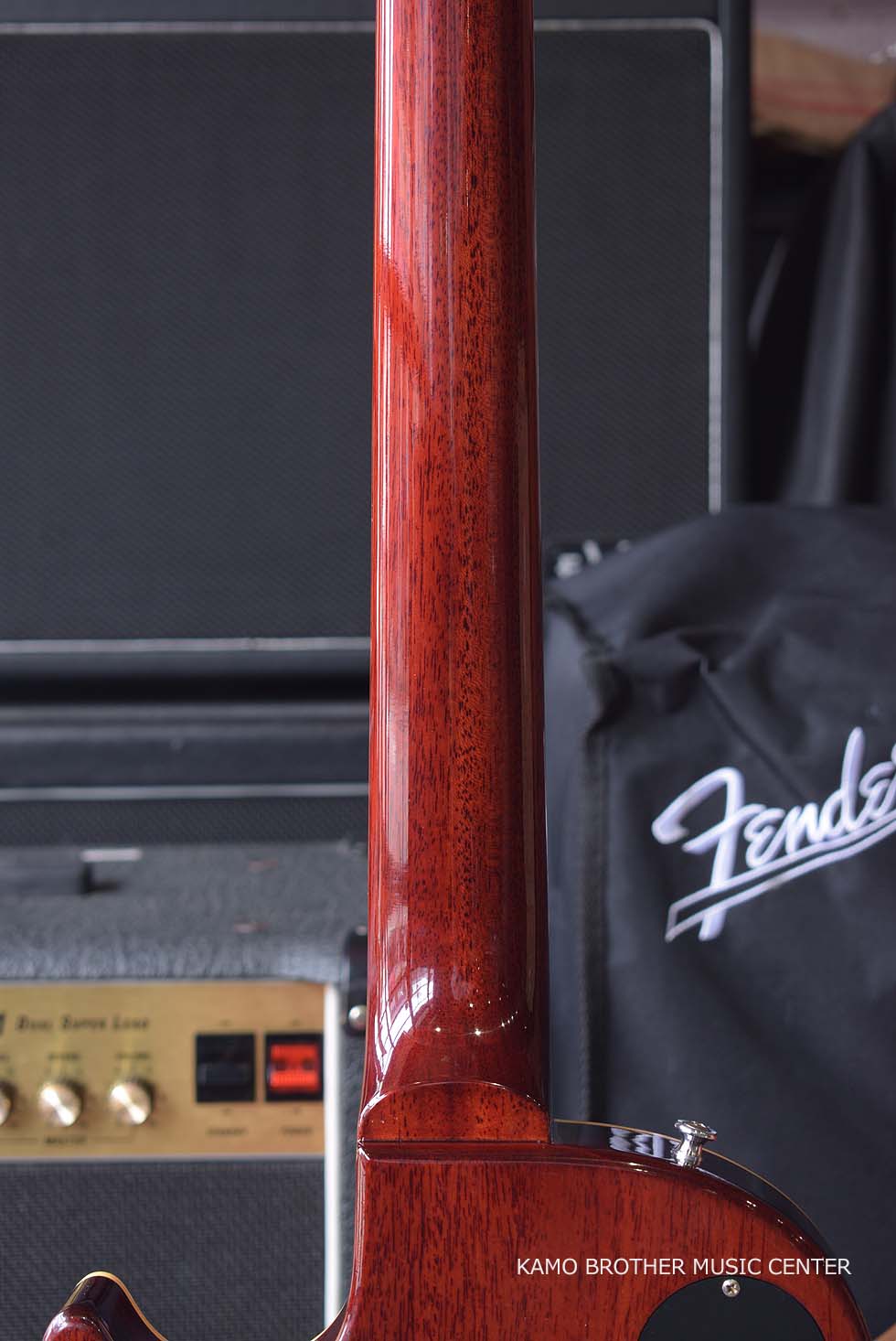 トップのメイプルは薄っすらとフレイムが入り、バーボンバーストカラーと相まって渋く落ち着いたルックスに仕上がっています。