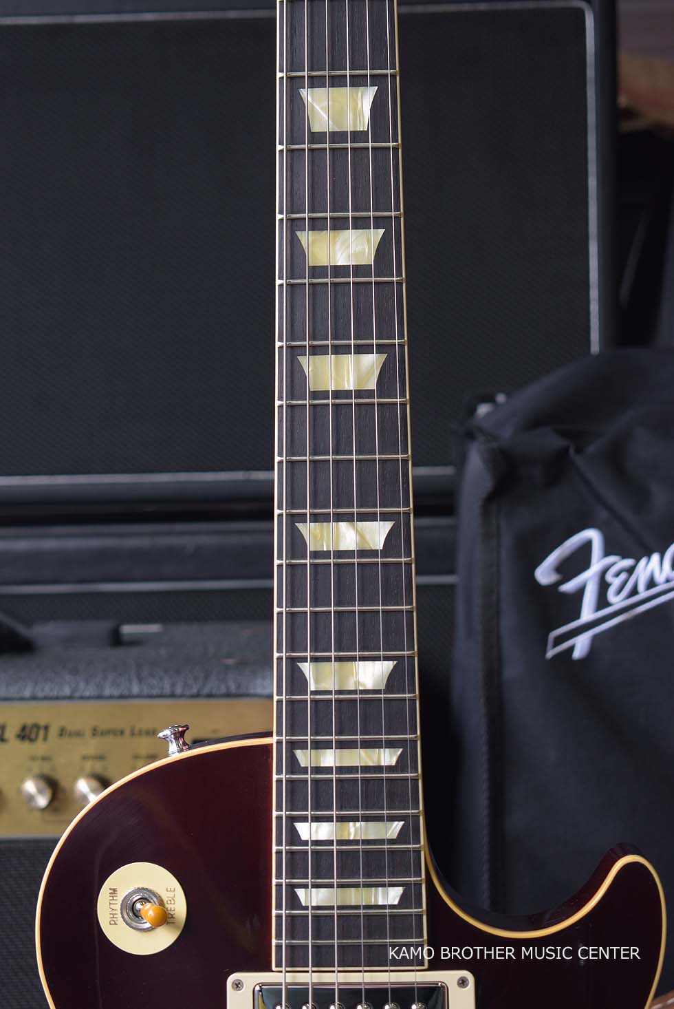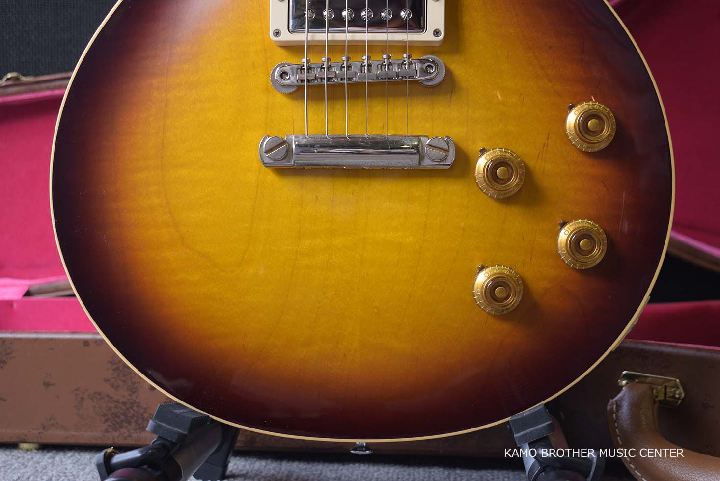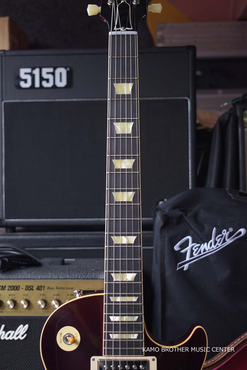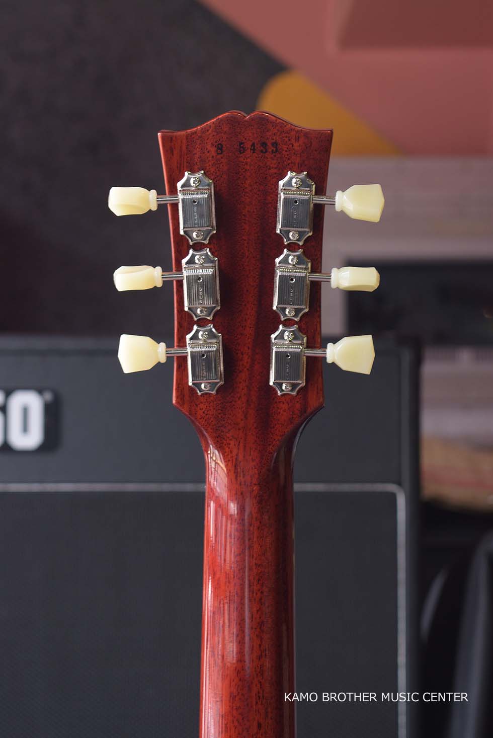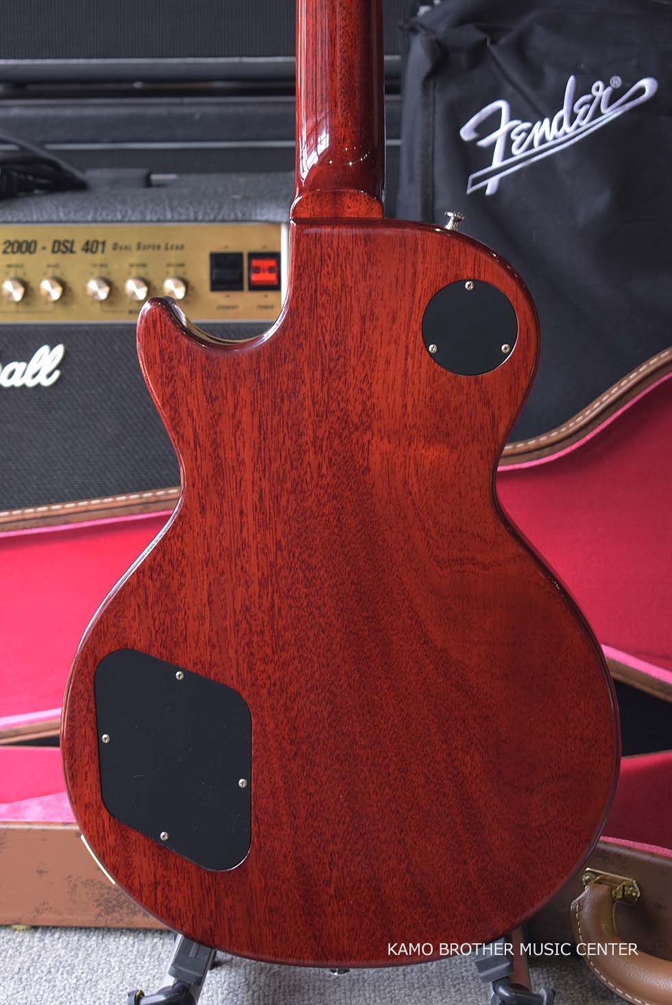 トップのメイプルは薄っすらとフレイムが入り、バーボンバーストカラーと相まって渋く落ち着いたルックスに仕上がっています。