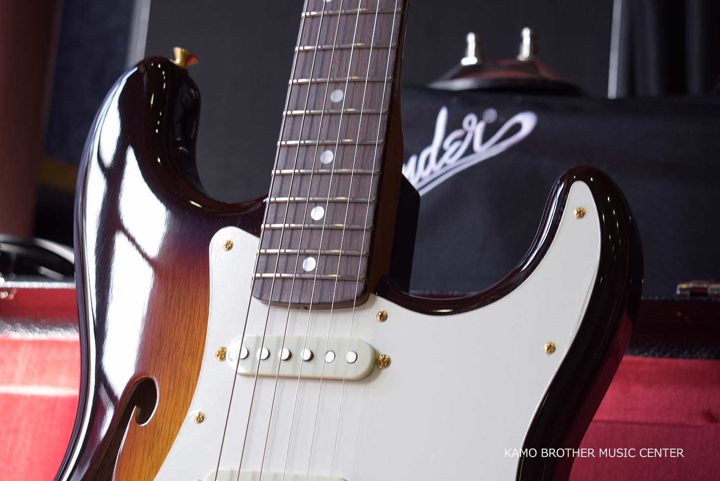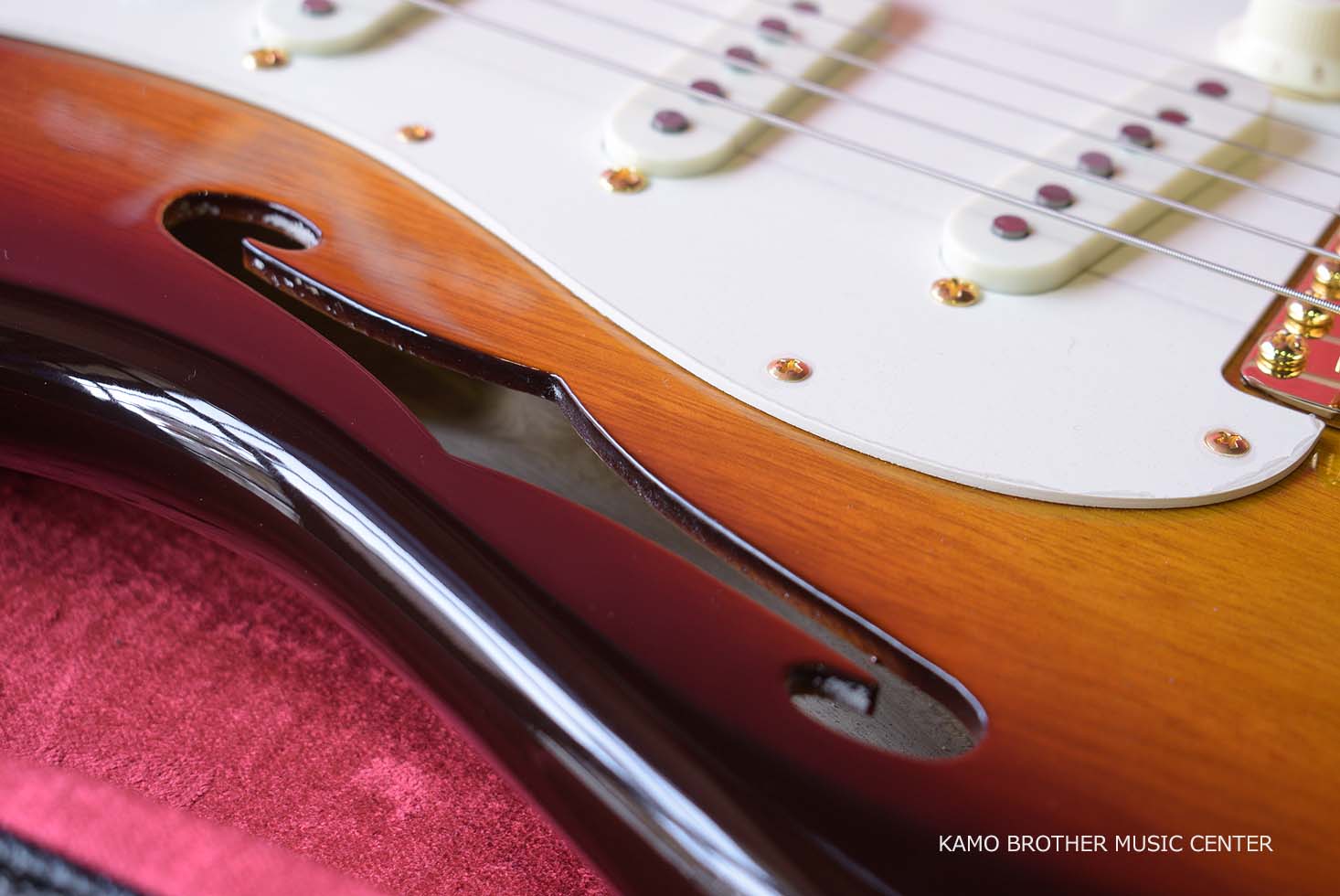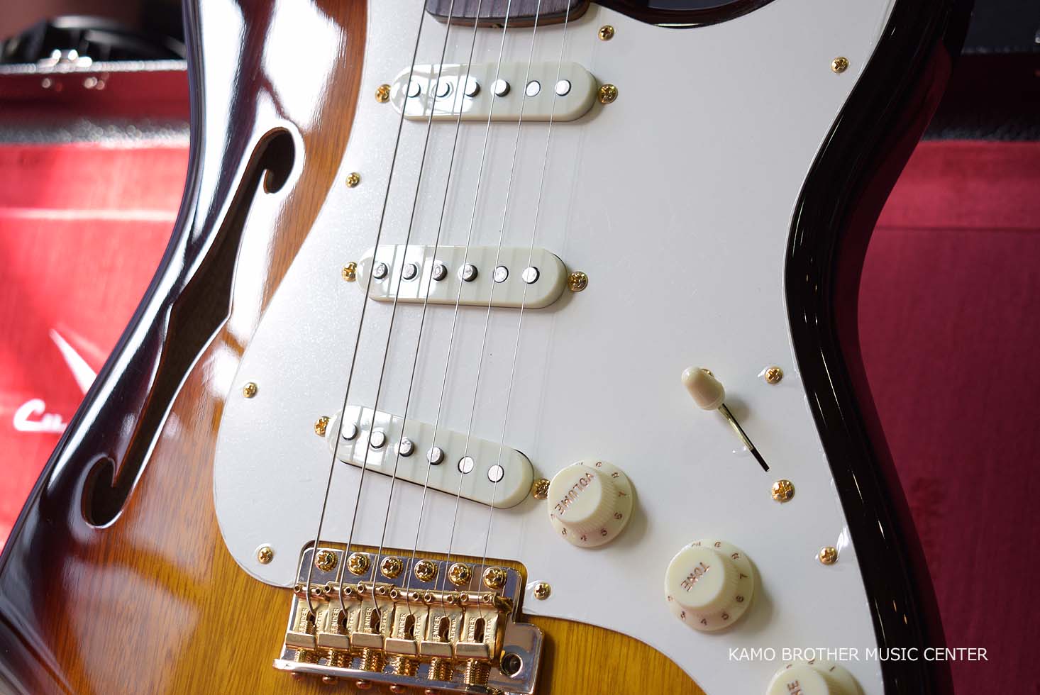 シングルFホール、2ピース セミホロウ ボディ構造で、NOSラッカー フィニッシュのChocolate Three-Color Sunburstにゴールドのハードウェアが採用されています。
