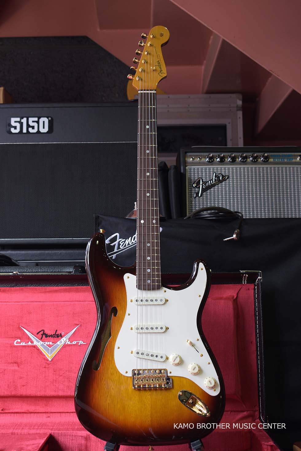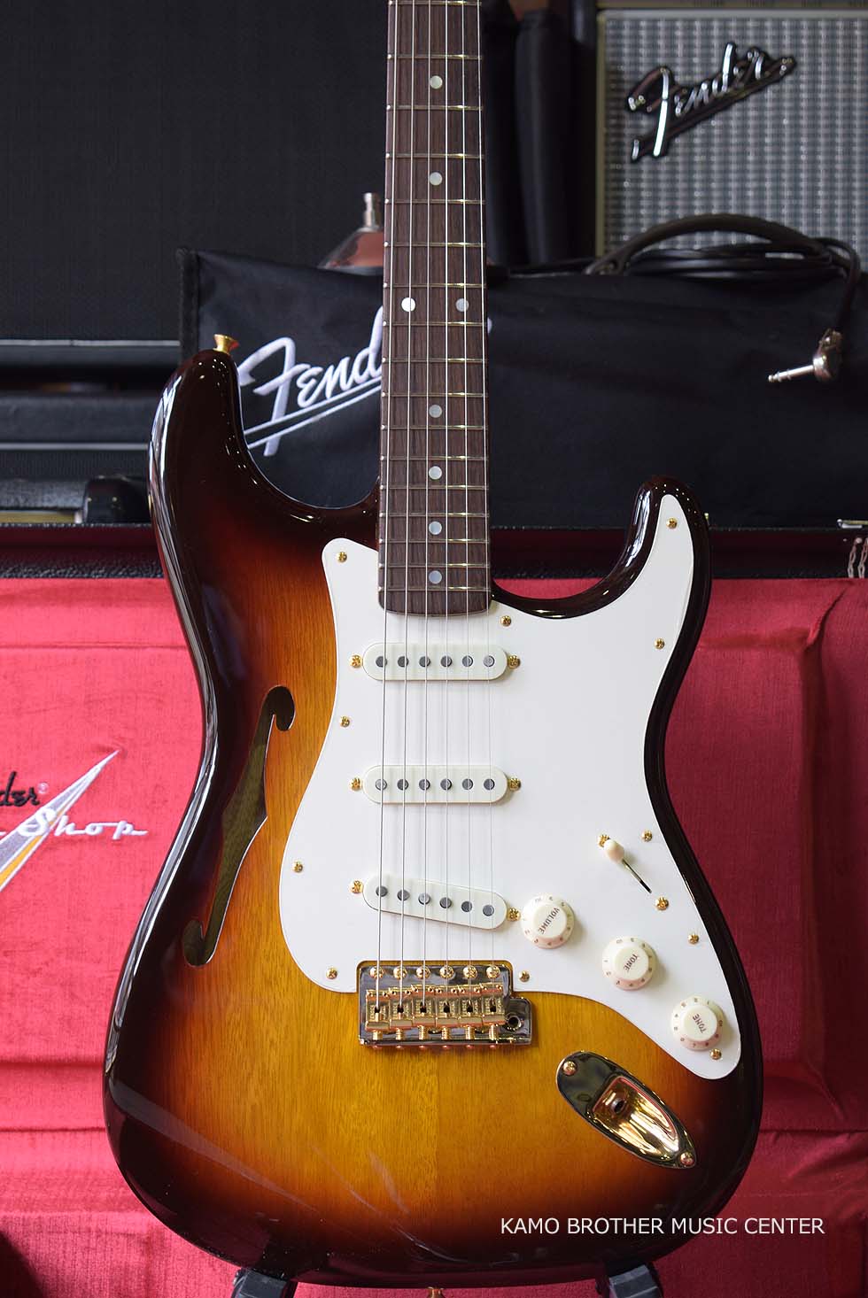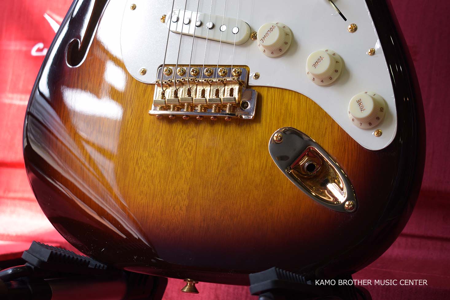 シングルFホール、2ピース セミホロウ ボディ構造で、NOSラッカー フィニッシュのChocolate Three-Color Sunburstにゴールドのハードウェアが採用されています。