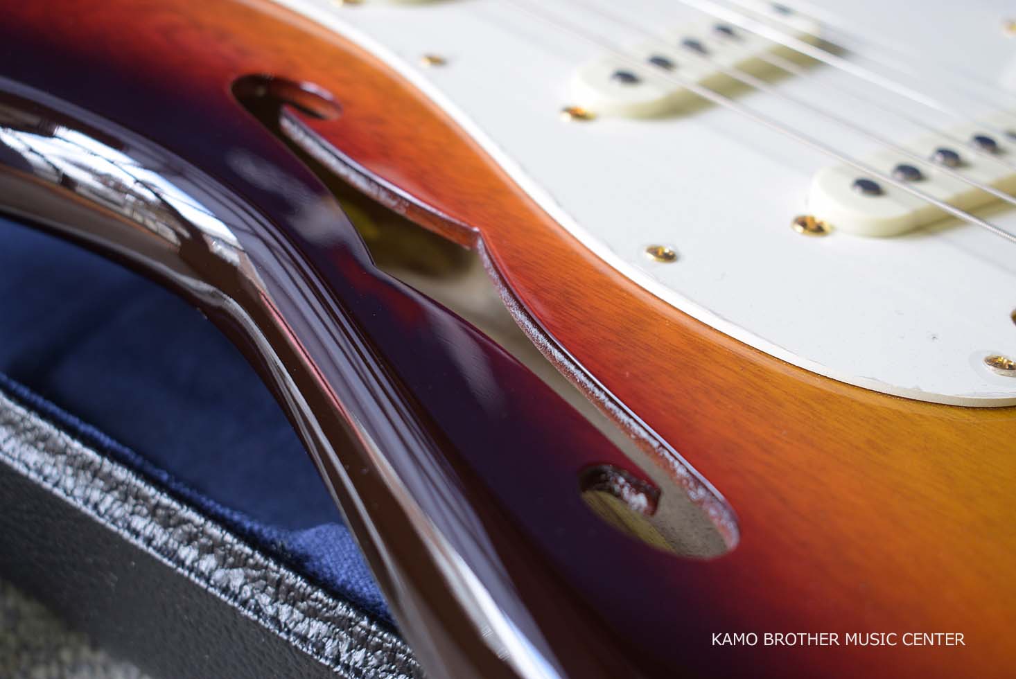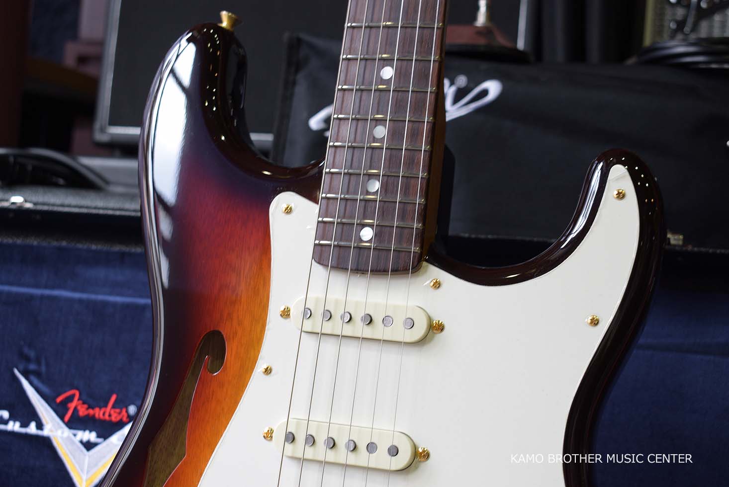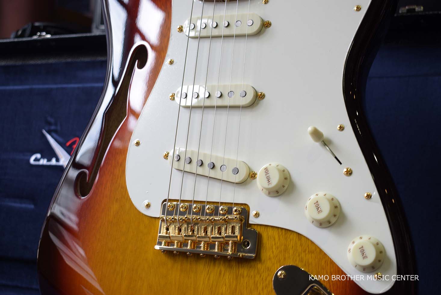 シングルFホール、2ピース セミホロウ ボディ構造で、NOSラッカー フィニッシュのChocolate 3-Color Sunburstにゴールドのハードウェアが採用されています。