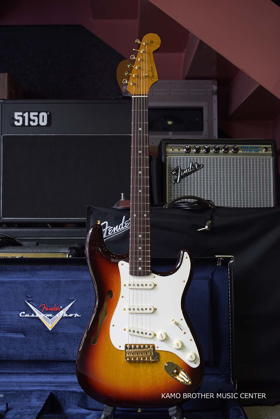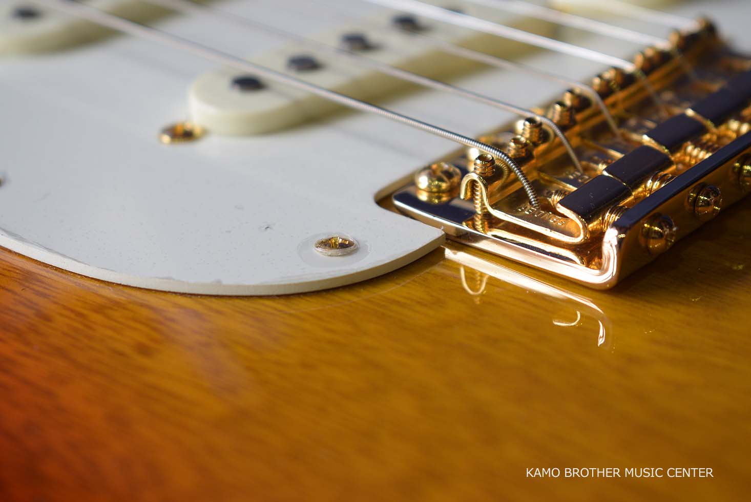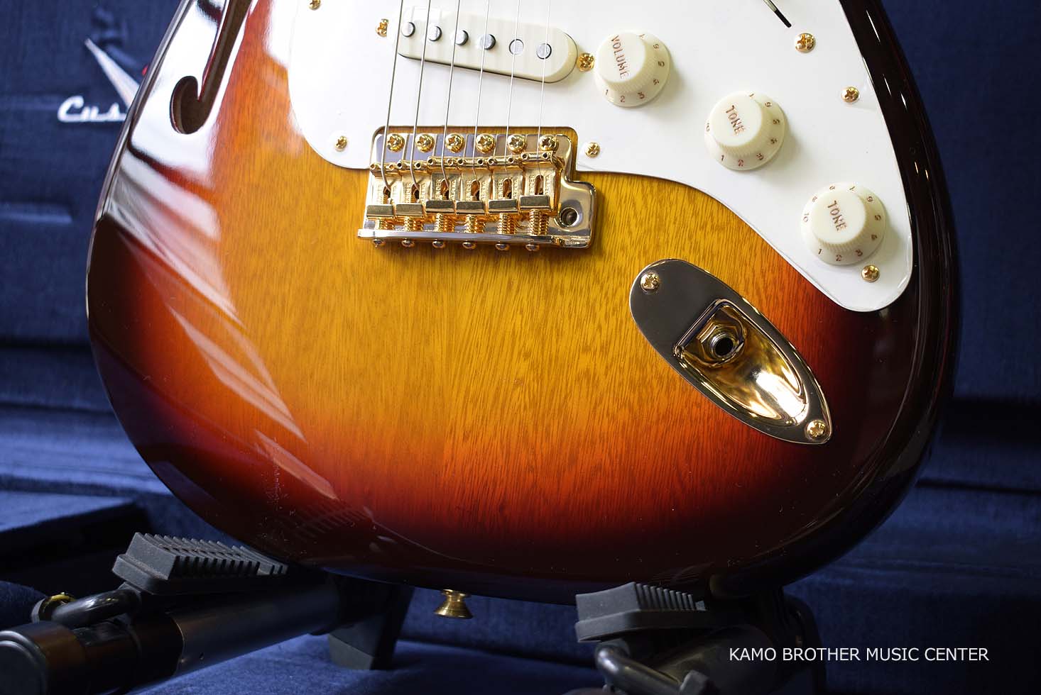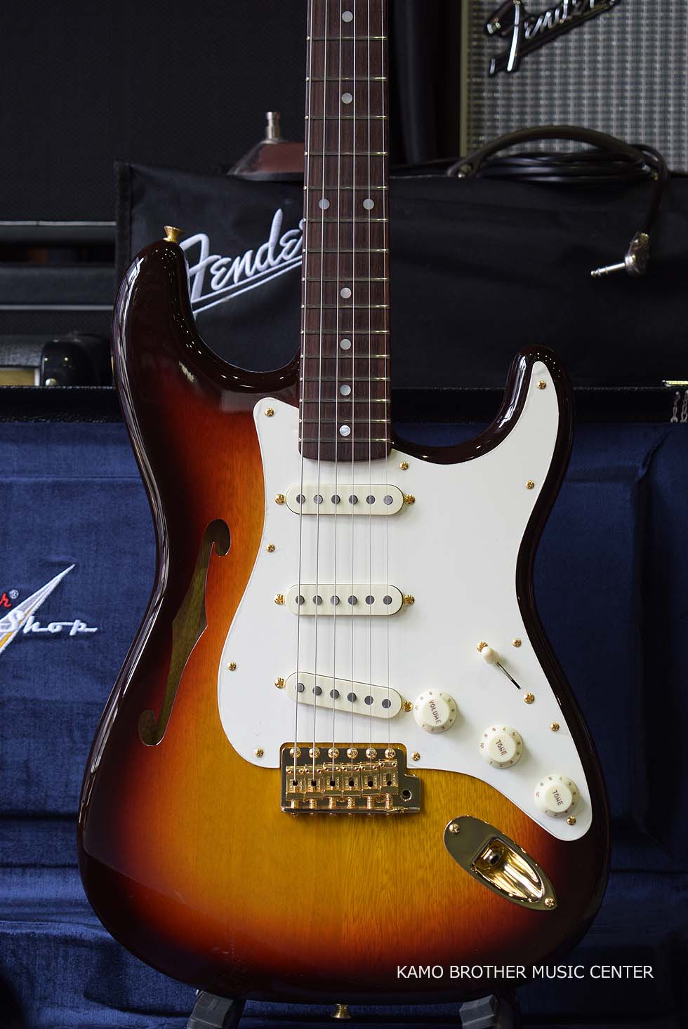 シングルFホール、2ピース セミホロウ ボディ構造で、NOSラッカー フィニッシュのChocolate 3-Color Sunburstにゴールドのハードウェアが採用されています。